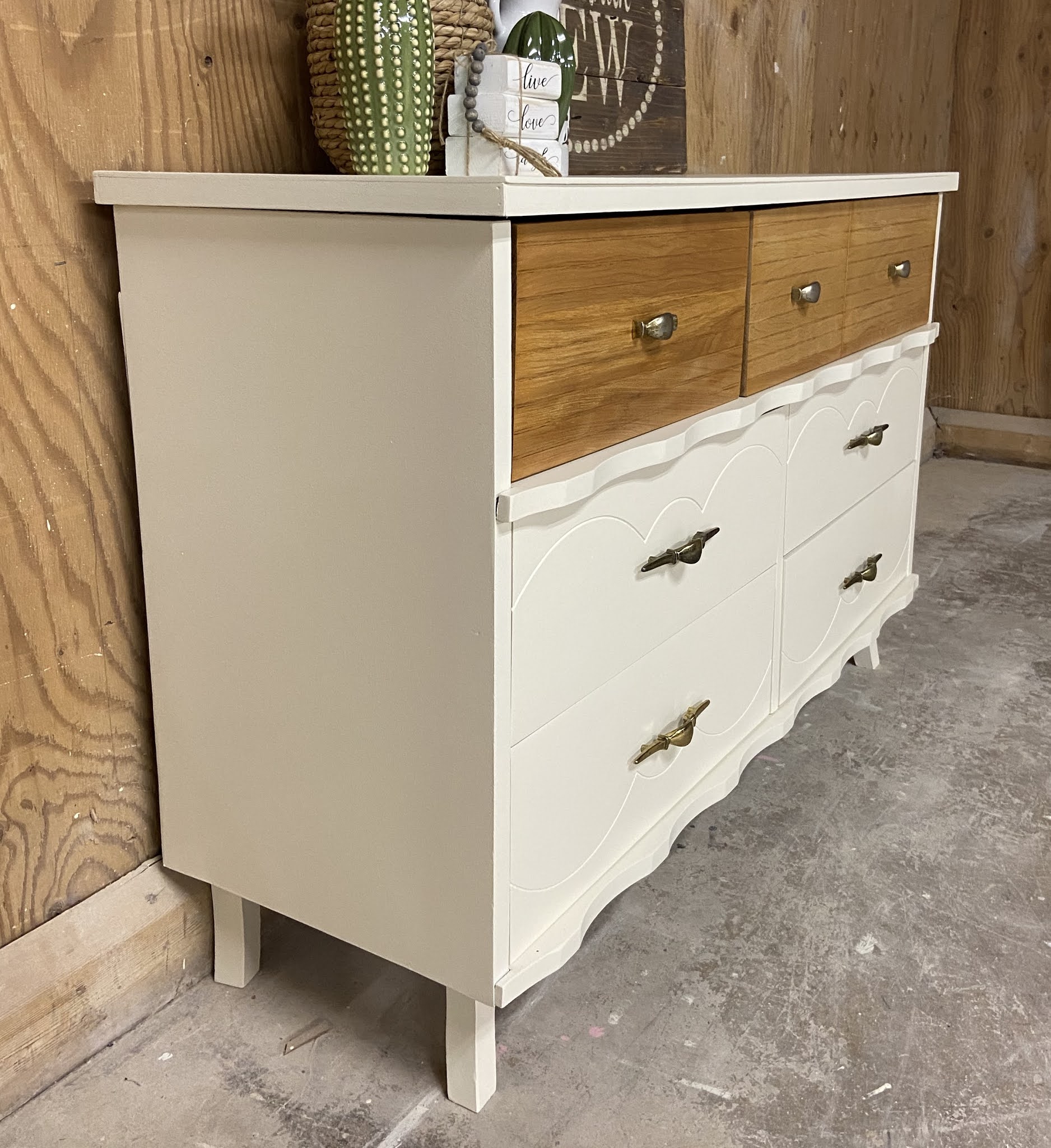 Let's talk about how pretty this MCM dresser looks now that we have gotten our hands on it. This dresser has been refinished in antique white. The drawers have been stained light and coated with poly. It will instantly make it feel like your bedroom got an upgrade.