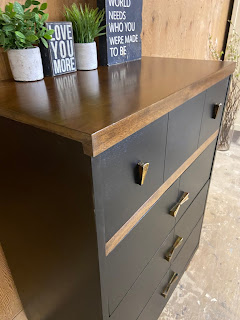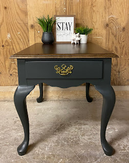 Did you know your furniture says a lot about you? Lol, neither did I...but just in case it's true you might want to stop by the shop to pick up this trendy little thing! You wouldn't want everyone to know that you are anything but trendy, right? This side table has been refinished in charcoal and coated with poly.The top has been stained dark walnut and coated with poly.