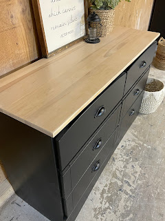 We love the simplicity of this dresser. The new hardware gives it a modern look, the light stained top turned out perfectly. This dresser has been refinished in black. This drawer has a decent amount of storage which is always good.